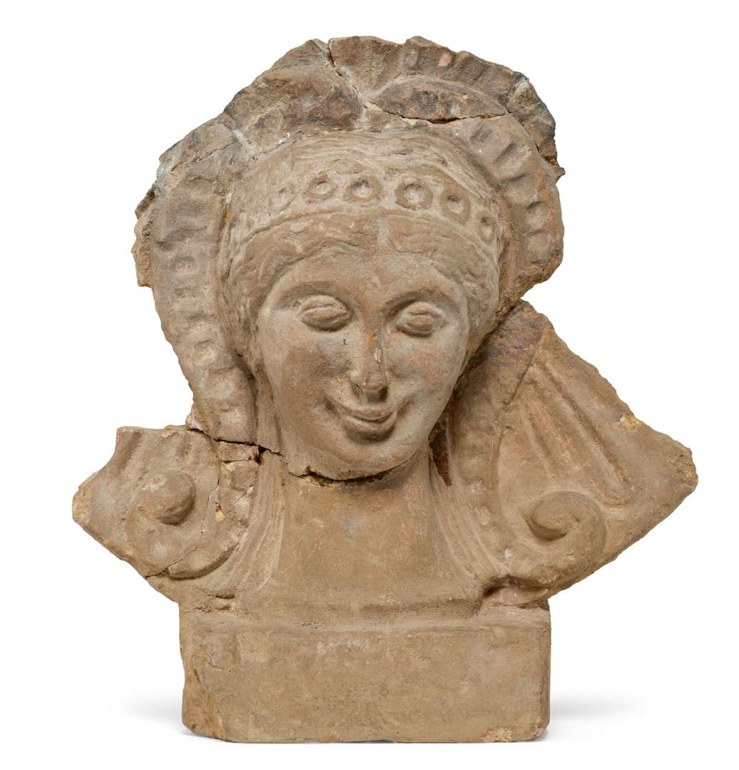 ANTÉFIXE À TÊTE DE MÉNADE en terre cuite beige commune, représentée de face, souriante, les yeux en amande, nimbée de godrons rayonnants et avec une coiffe en forme de coeur retombant sur les épaules en volute. Base rectangulaire. Italie, culture étrusque, VIe-Ve siècle av. J.-C.