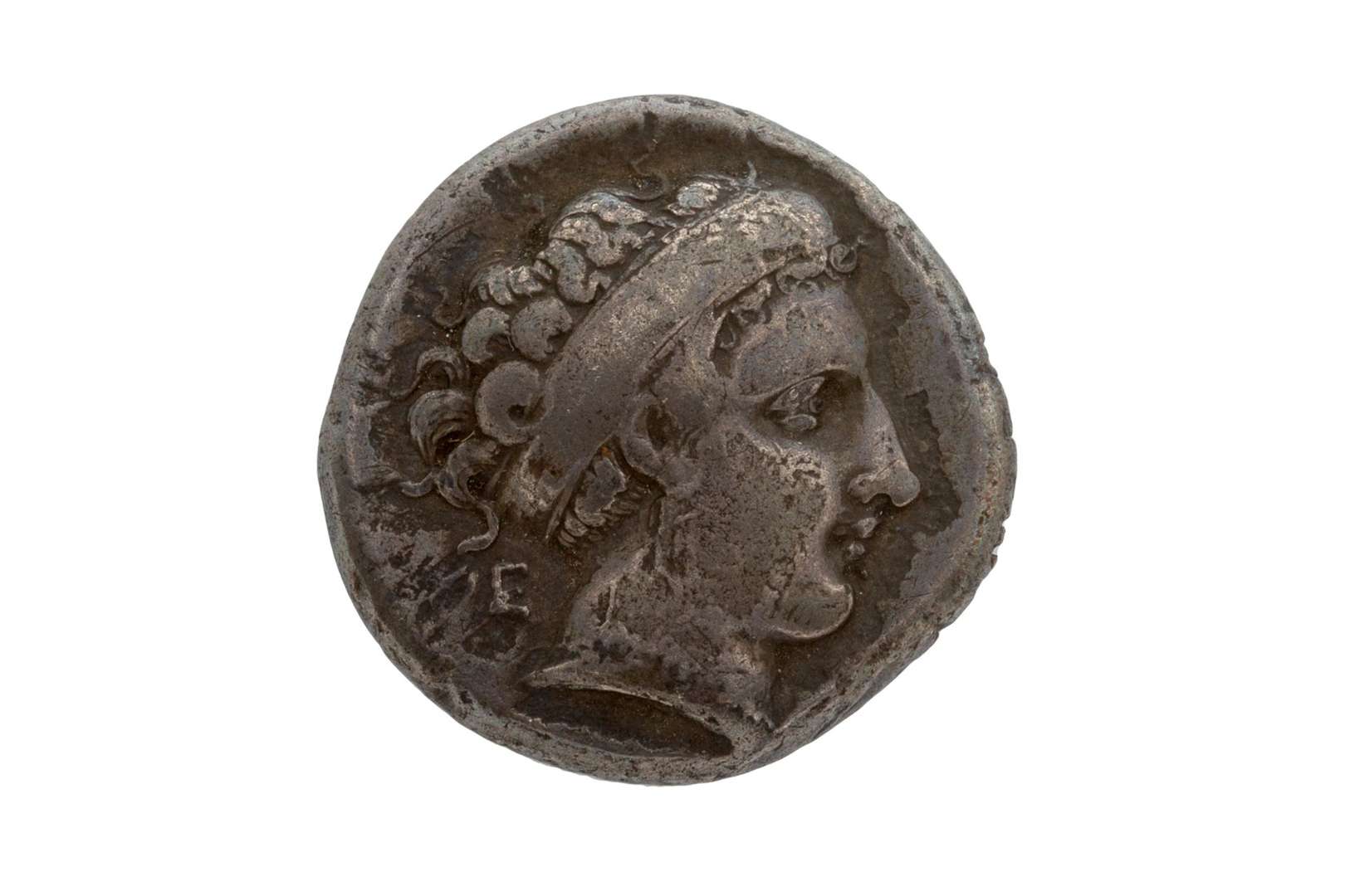 Pièce de monnaie en argent figurant à l'avers une tête de nymphe de profil tournée vers la droite, portant un large bandeau, une boucle d'oreille à trois pendants et un collier de perles | E derrière le cou. Au revers, un taureau à tête d'homme marchant à droite, tête de face | au-dessus, une Niké volant à droite, plaçant une couronne sur la tête du taureau. Néapolis (Naples), Campanie, 350-325 av. J.-C.