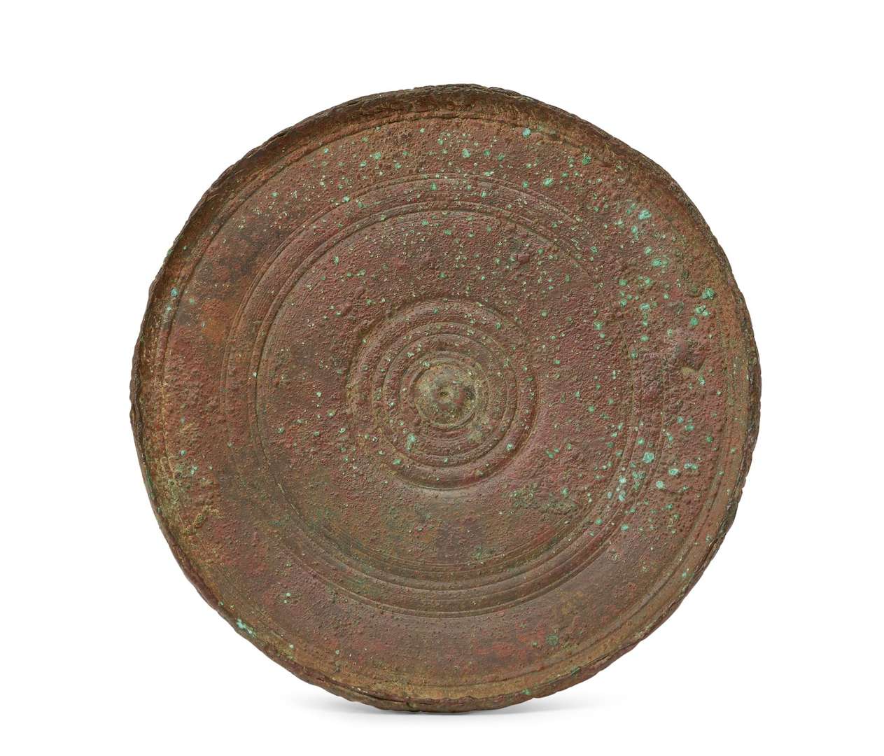 MIROIR CIRCULAIRE en bronze, décor de cercles concentriques. Antiquité, probablement Rome.