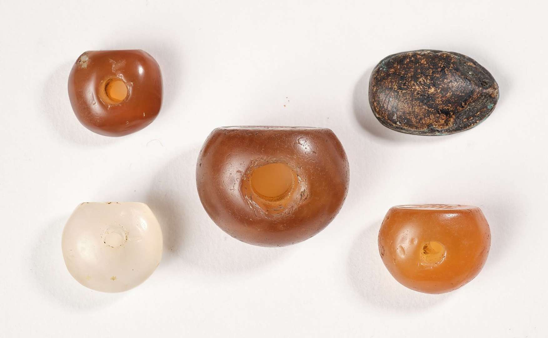 LOT DE QUATRE INTAILLES en pierre dure percées formant perle :-Un faucon en agate brune. Longueur : 1,9 cm