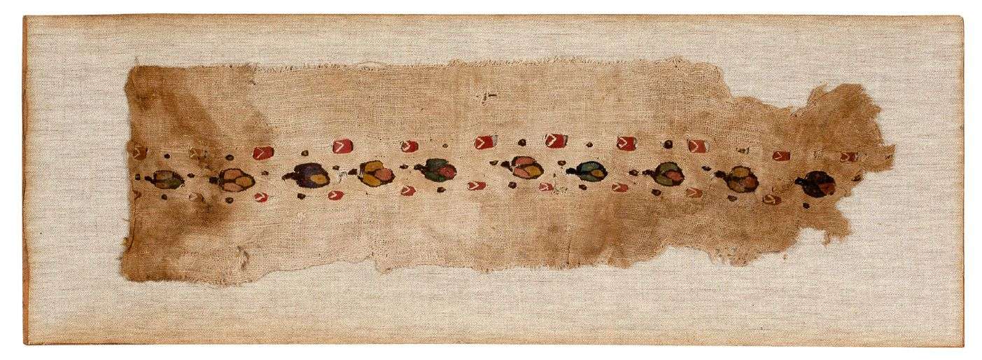 Fragment de Tunique orné de plantes polychromes ponctuées de carreaux rouges. Tapisserie en laine sur toile de lin.Égypte, art Copte, VIIe siècle.