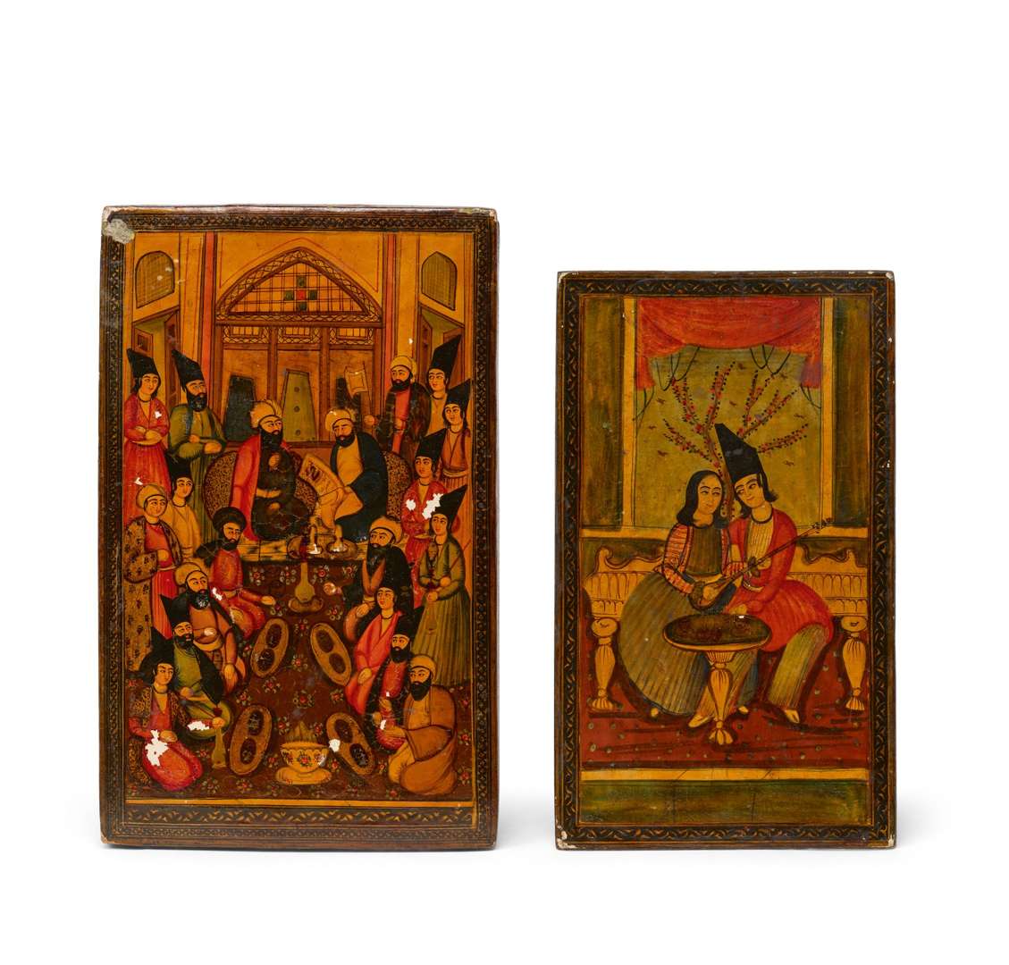 BOÎTE À MIROIR QADJAR en papier mâché ou carton peint à la manière des laques. La couverture à deux faces est ornée sur l'une d'une scène festive avec plusieurs personnages dont musiciens et cavaliers et sur l'autre face d'un couple jouant de la musique. Le revers est décoré d'une scène de lettrés fumant et conversant. Iran, époque Qadjar, XIXe siècle.