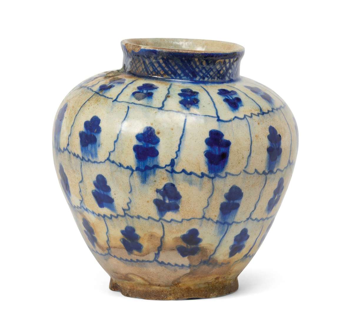 Vase pansu en céramique glaçurée à décor bleu blanc. Signature sous la base. Iran, XIXe siècle.