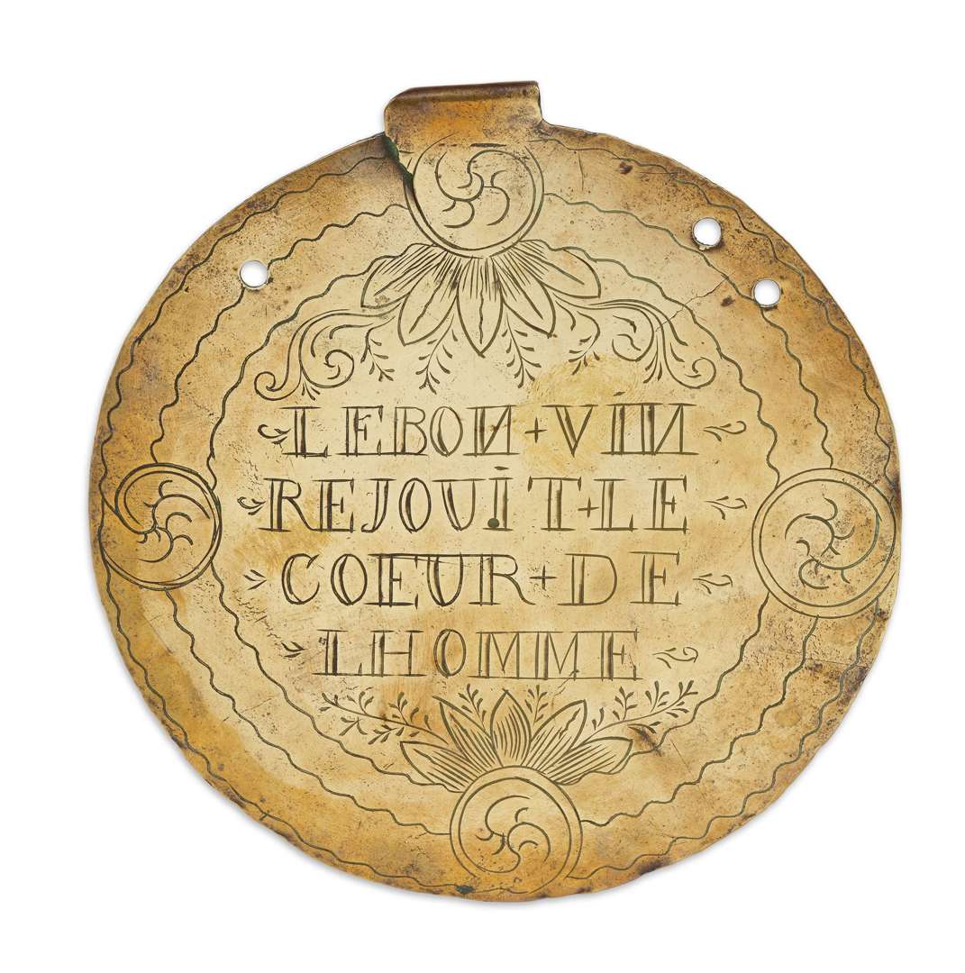 PLAQUE MULETIÈRE en laiton gravée de l'inscription «LE BON VIN REJOUIT LE COEUR DE L'HOMME». Savoie ou Languedoc, fin du XVIIIe siècle.