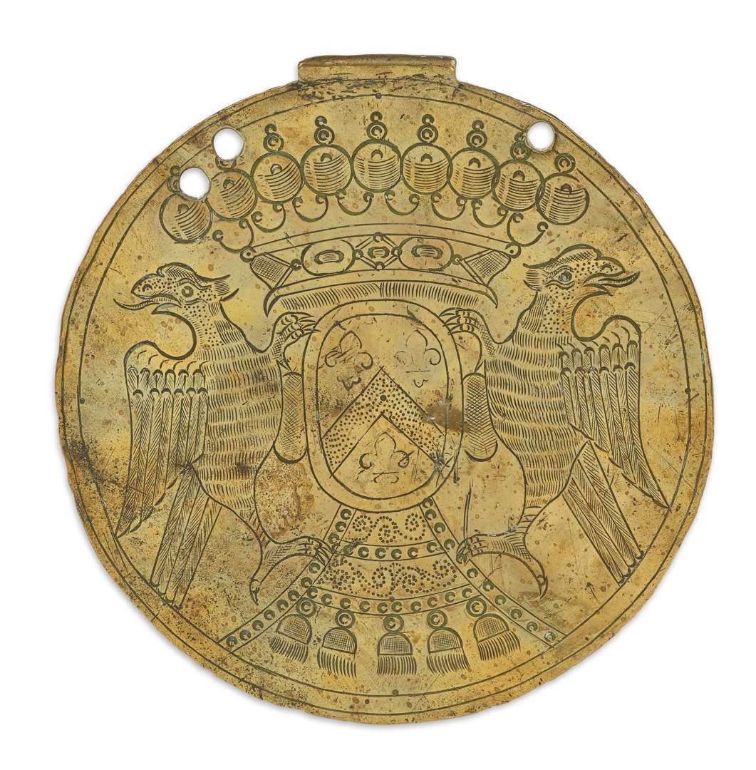 PLAQUE MULETIÈRE en laiton gravée d'un décor d'armoiries sous une couronne comtale : un chevron d'or accompagné de trois fleurs de lys, deux aigles en support. Probablement Velay, milieu du XVIIIe siècle.