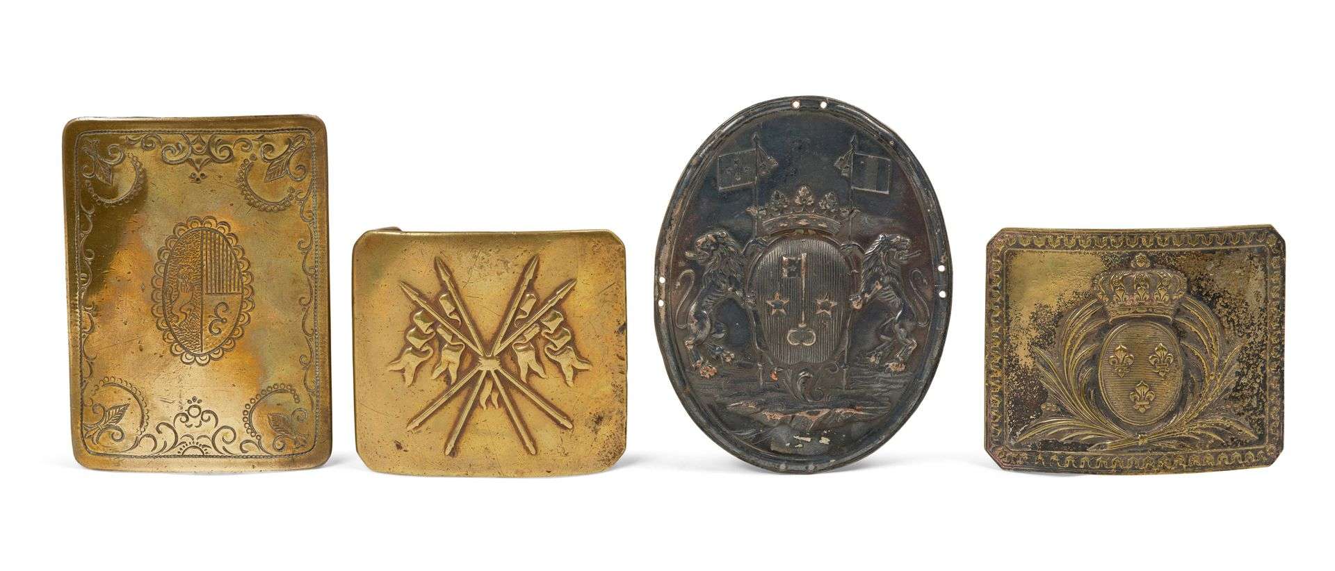 - Trois plaques de ceinture en laiton embouti ou gravé dont l'une aux armes de France. XIXe siècle.