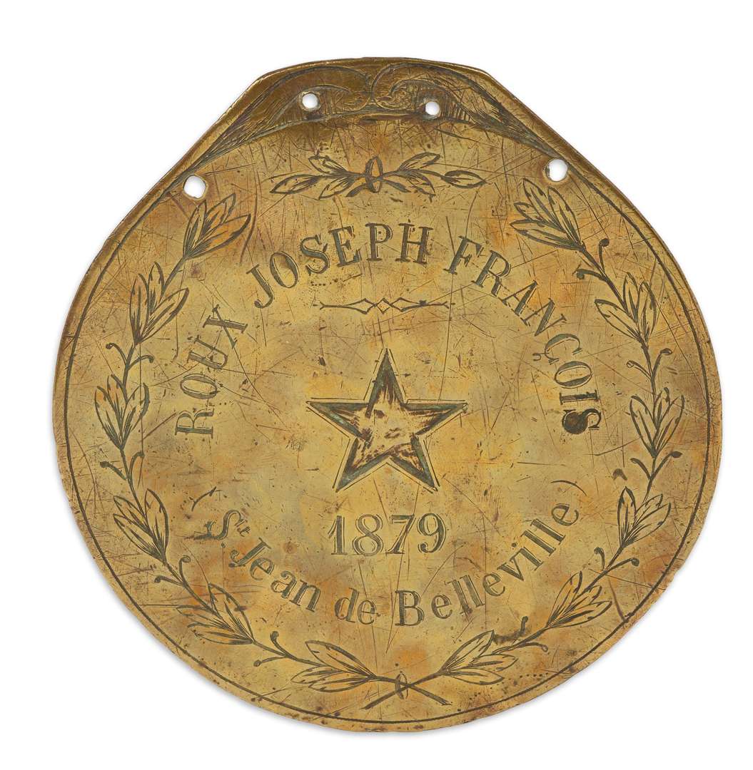 PLAQUE MULETIÈRE en laiton gravé d'une étoile et d'une couronne de laurier. Inscriptions gravées : «ROUX JOSEPH FRANÇOIS-1879-St Jean de Belleville». Savoie, XIXe siècle.
