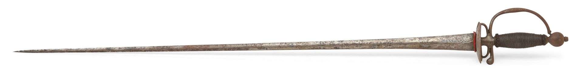 Monture en fer à pas d'âne dit «à la mousquetaire». Pommeau rond, arc de jointure avec quillon en forme de goutte dans le prolongement. Plateau à double pontat décoré au trait. Fusée en bois recouverte d'un filigrane et bonnets d'évêque. Lame droite forte au talon à section triangulaire ciselée au quart à décor d'un soleil rayonnant et entrelacs. Seconde moitié du XVIIIe siècle.
