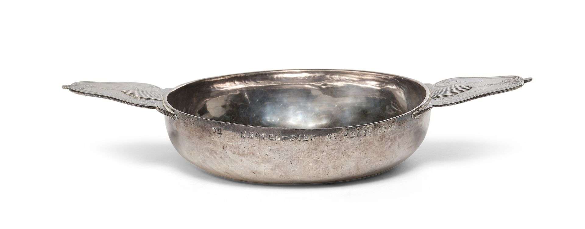 ÉCUELLE DITE «BOL À SAIGNÉE» en argent uni, deux anses plates contournées gravées de rinceaux feuillagés et ornées de coquilles en reliefs. Gravé sur la panse : « Sr Nicole Chatelain à l'infirmerie / de l'Hôtel Dieu de Reims 1775 ». Poinçons sur la cuve : Antoine Lelarge, Reims, 1727 et poinçon de maître sur les anses : Jacques Lelarge (reçu maître en 1733).