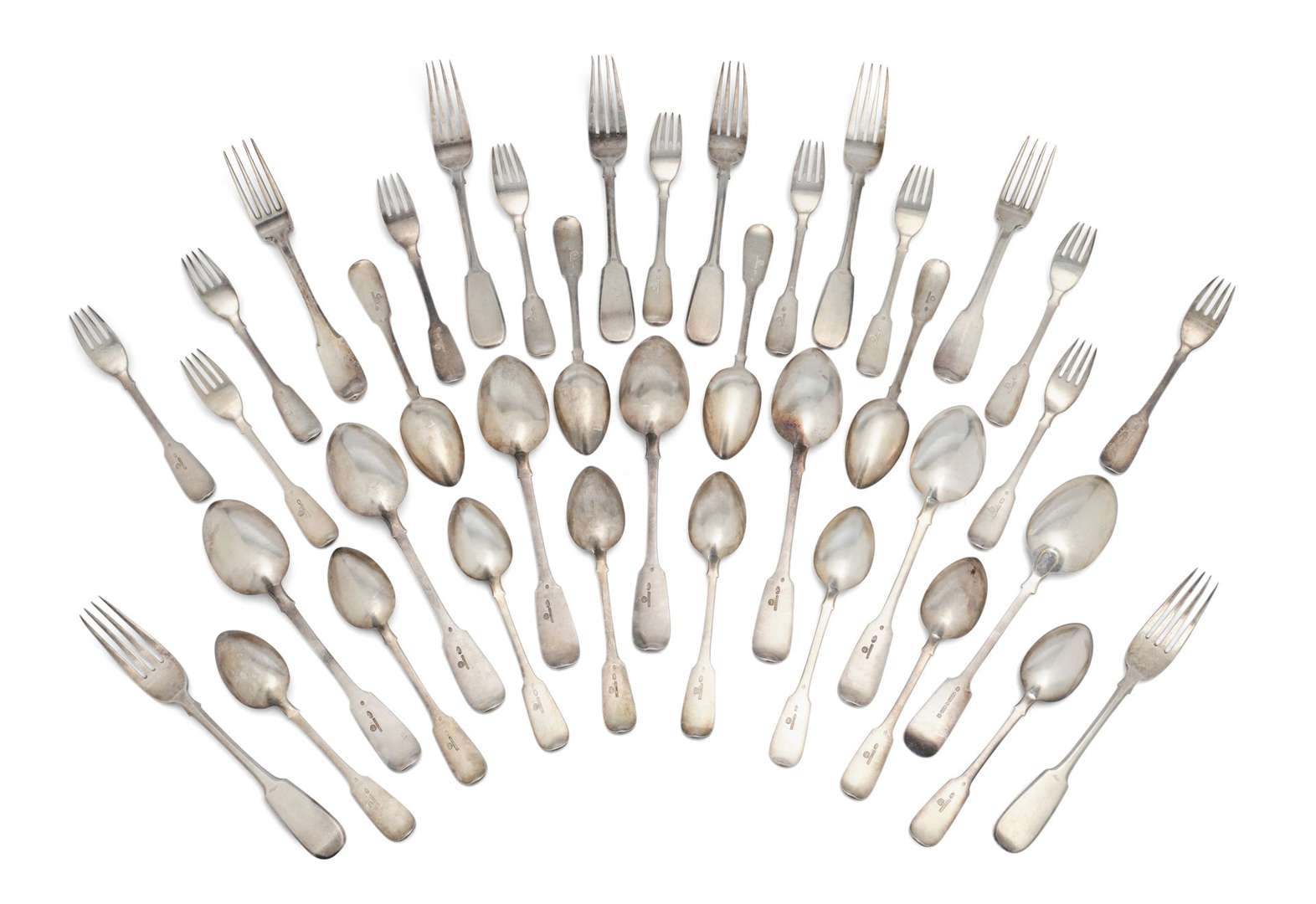 PARTIE DE MÉNAGÈRE en argent comportant :-Douze cuillères et onze fourchettes. Longueur : 15 cm