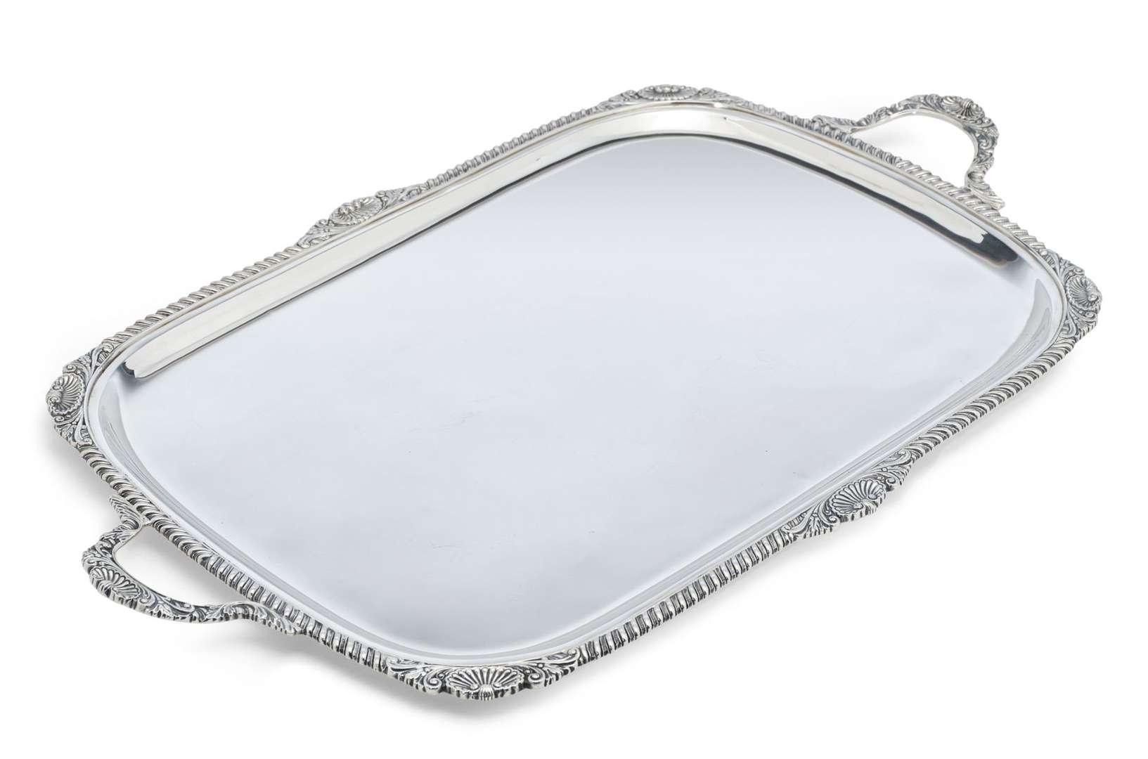 IMPORTANT PLATEAU en argent de forme rectangulaire, la bordure à décor de frise de godrons et coquilles feuillagées. Les anses également à décor de coquilles feuillagées. Angleterre, Londres, 1813. Maître orfèvre non identifié (I S ?)