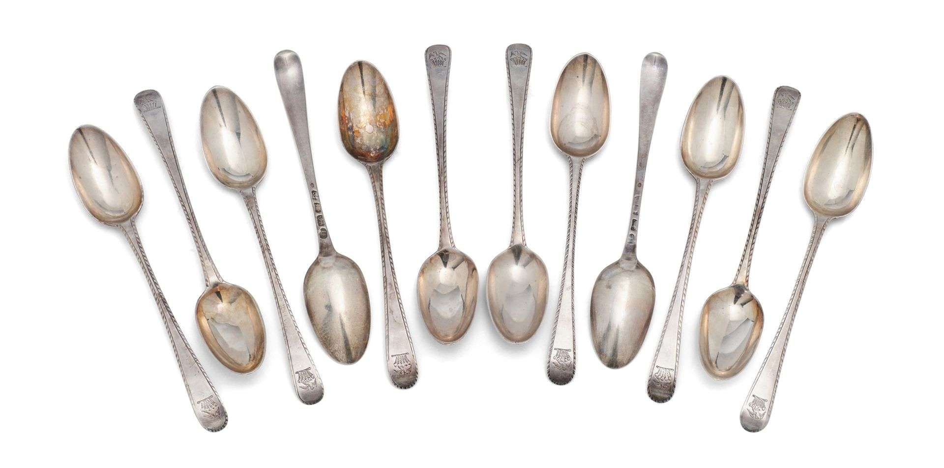 LOT DE DIX PETITES CUILLÈRES en argent, le manche frisé au pourtour et gravé d'un crest : oiseau s'échappant de roseaux. Angleterre, Londres, 1776. Maître orfèvre : John Lambe.