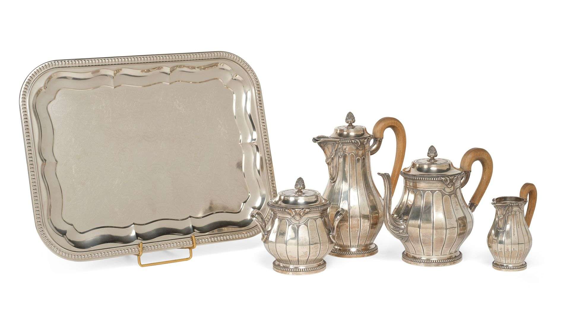 Service à thé et à café en argent, les anses en bois tourné composé :