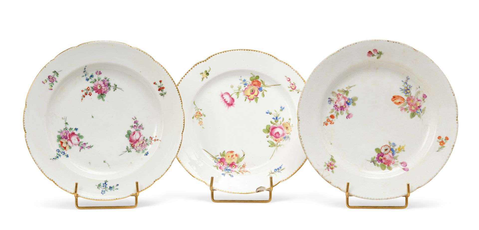 Deux assiettes polylobées en porcelaine à décor polychrome de jetés de bouquets de fleurs. Marque aux flambeaux croisés en bleu. XVIIIe siècle