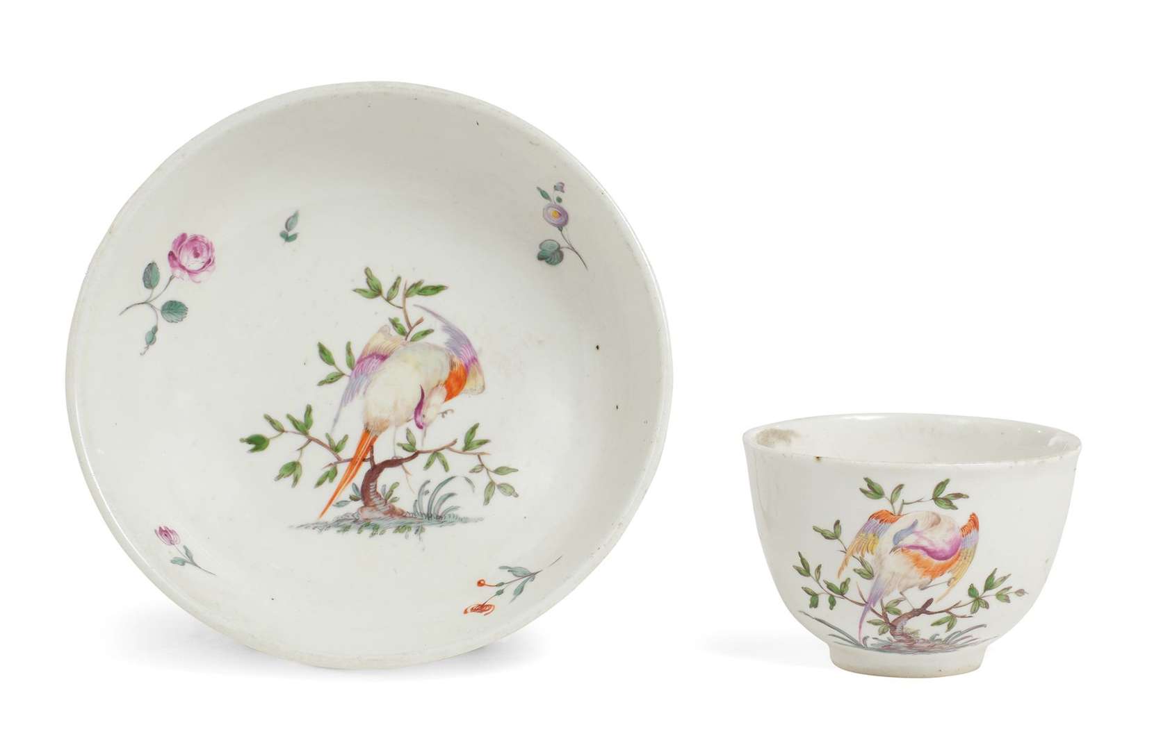 Tasse à thé et sa soucoupe en porcelaine à décor polychrome d'oiseaux sur terrasse et fleurs. Marquées : CT couronnés en bleu. XVIIIe siècle, vers 1760.