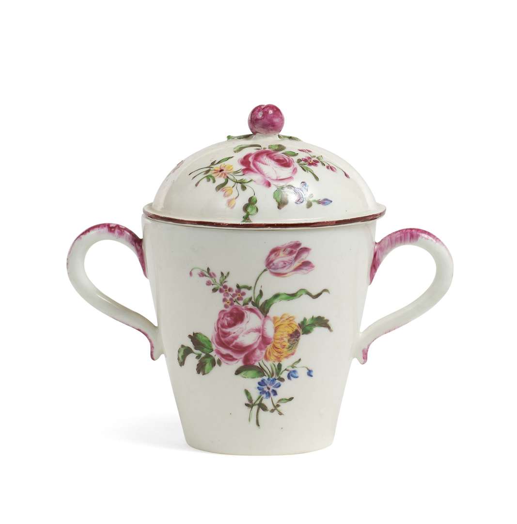 Coupe couverte à deux anses en porcelaine blanche à pâte tendre, la panse et le couvercle à décor de bouquets de fleurs. La prise du couvercle en forme de fruit et feuillage. Marque en creux D.V. XVIIIe siècle.