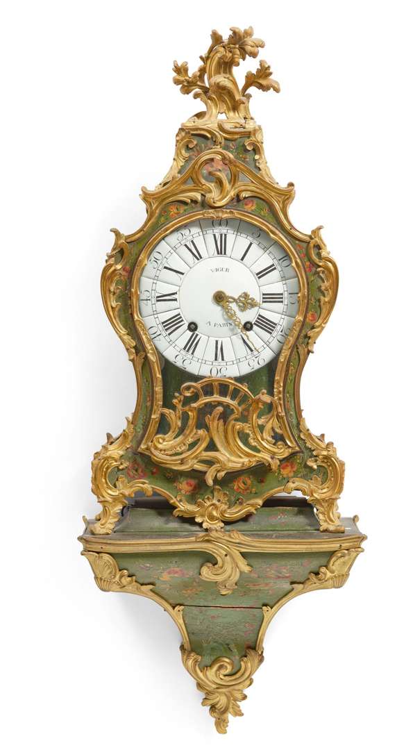 en bois vernis martin et bronze doré accompagné de sa console à poser. Le cabinet de forme violonnée à décor de vernis martin sur fond vert avec des motifs de fleurs polychromes, une riche ornementation de bronzes dorés avec décor de feuilles d'acanthes stylisées, estampille de Lieutaud. Cadran émaillé blanc avec indication des heures en chiffres romains et arabes pour les minutes, signé « Viger à Paris ». Mouvement avec remontage à clef, deux ouvertures avec carré de remontage pour le mécanisme horloger. La platine carrée porte la signature « Viger à Paris ».