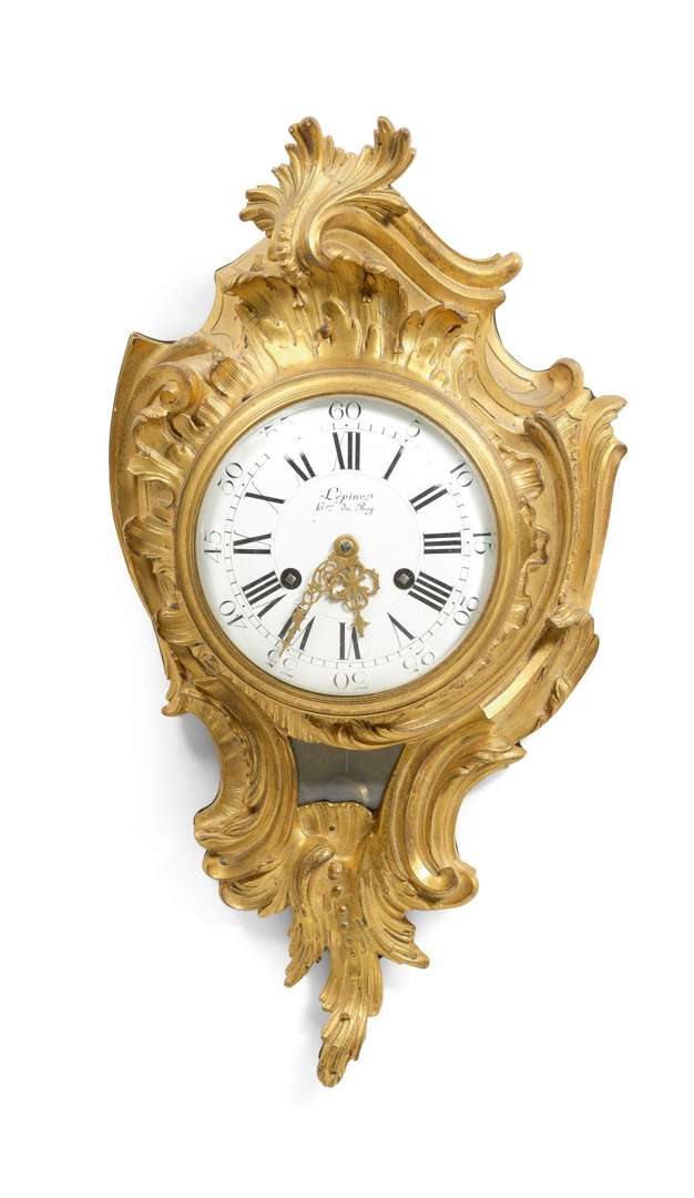 en bronze ciselé et doré, richement décoré de rocailles et feuilles d'acanthes, estampillé du « C » couronné. La lunette au centre sur une charnière. Une ouverture sur la base pour voir la lentille du balancier dit à « fil ». Cadran en émail blanc avec chiffres romains pour les heures et arabes pour les minutes, aiguilles stylisées et minuterie chemin de fer, signé « Lépine Hger du Roy ». Mouvement avec remontage à clef, double ouverture pour le carte de remontage au centre, mécanisme de sonnerie au passage à répétition des quarts et demi-heures.