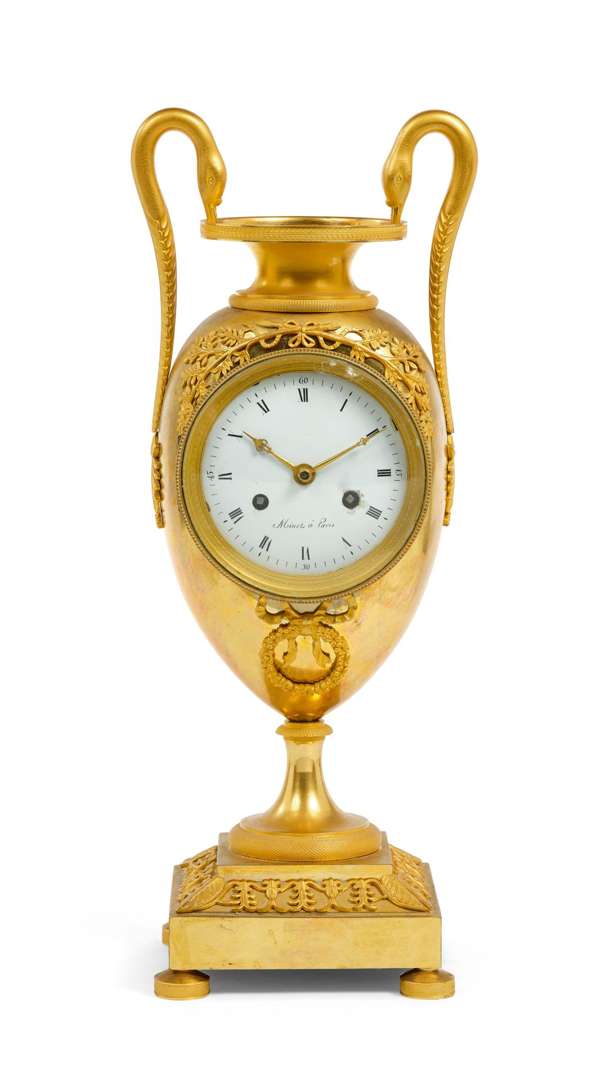 en bronze doré en forme de vase avec deux cols de cygnes. Le corps central avec un décor à rehauts typique de la période Empire. La base cubique reposant sur des pieds cylindres. Au centre un cadran émaillé blanc avec chiffres romains pour les heures et arabes pour les minutes, deux ouvertures avec carré de remontage, aiguilles stylisés et minuterie chemin de fer, signature « Minet à Paris ». Mouvement rond avec balancier suspension dit « à fil », sonnerie à un marteau sur timbre, l'ensemble visible sur une face vitrée. (fêles)