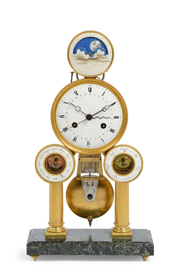 avec indication des quantièmes, phases et âges de la lune. La partie centrale repose sur deux colonnes en laiton doré, supportant deux cadrans auxiliaires squelettes avec cercles émaillés blancs avec une double frise en bronze ciselé et doré, l'un pour l'indication des mois avec indication en 30, 31 ou 28 jours et l'autre pour les jours de la semaine et signes astronomiques. Dans la partie supérieure se trouve le cadran principal émaillé dans un entourage en bronze ciselé et doré avec chiffres romains pour les heures et arabes pour les minutes, une graduation externe chemin de fer, trotteuse centrale pour le battement de la seconde, une aiguille serpentine pour le quantième de la date et deux carrés de remontage pour le mécanisme horloger et celui de la sonnerie. Au sommet se trouve une cadran émaillé blanc et polychrome pour l'indication des phases et âges de la lune sur disque tournant.