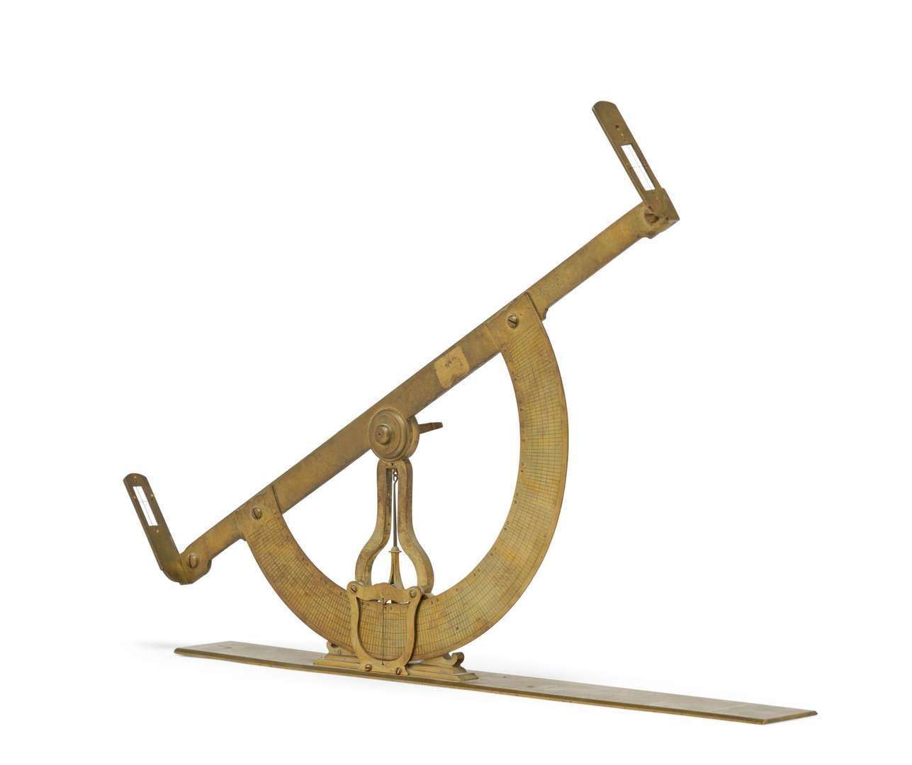 GRAPHOMÈTRE À PINNULES en laiton, le demi-cercle gradué supporte l'alidade à pinnules et s'incline sur un axe formant clinomètre (pour la mise à l'équerre) | il repose sur une règle d'architecte. France, probablement XVIIIe siècle.