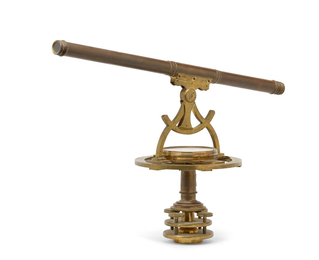 RARE THÉODOLITE PAR JAMES SIMONS la lunette de cuivre (anciennement doré) est ajustable sur les deux plans ainsi qu'en longueur pour la mise au point. L'inclinaison est graduée sur un quart de cercle gravé «Links / Chain». La lunette surmonte une bousole richement gravée de fleurons et une fleur de lys, avec niveau à bulle. La platine de la boussole plaquée d'argent est signée J.Simons London. L'orientation horizontale se calcule sur un cercle entier gravé à 360 degrés. L'ensemble de l'instrument repose sur un pivot rotatif. Angleterre, Londres, époque Georges III, vers 1770.