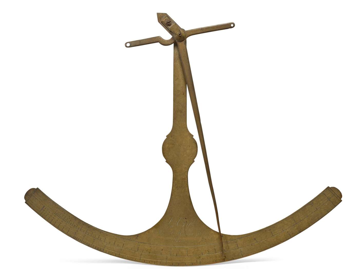 ÉLÉMENT PRINCIPAL DE BALANCE en laiton, en forme d'ancre, graduations et signature gravées : «L. Ory Rue Saint Antoine 43 Paris». France, première moitié du XIXe siècle.