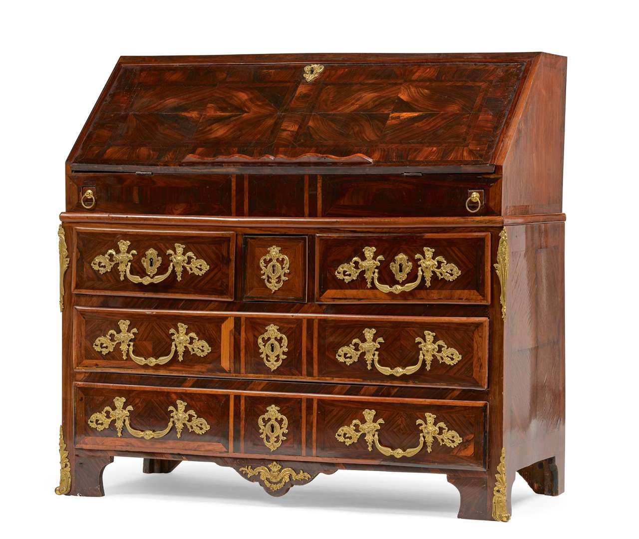 COMMODE-SCRIBAN en palissandre. le caisson supérieur ouvre par un abattant avec baguette porte-livres s'appuyant sur deux tirettes garnies de boutons en bronze doré. Il découvre six tiroirs à gradin et des casiers. Un petit vantail central. Un rangement caisson. Partie basse ouvrant à quatre tiroirs sur trois rangs. France, première moitié du XVIIIe siècle. Garniture de bronze doré aux valets, dessus de cuir brun doré aux petits fers.
