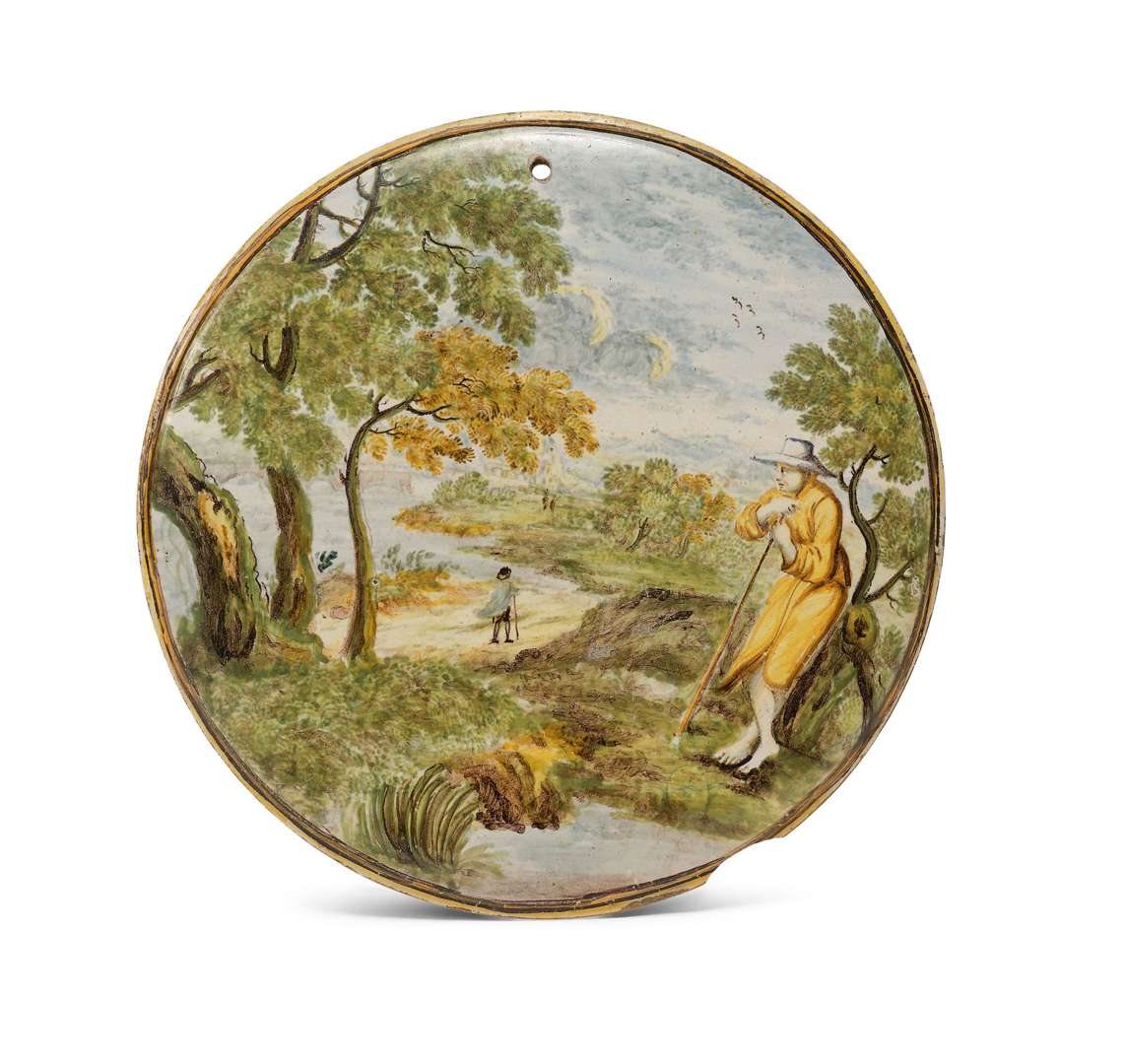 Lot de deux plaques circulaires en faïence à décor peint polychrome de deux promeneurs dans un paysage en plein sur l'une et d'une scène d'un débarquement de marchandises sur l'autre. XVIIIe siècle.