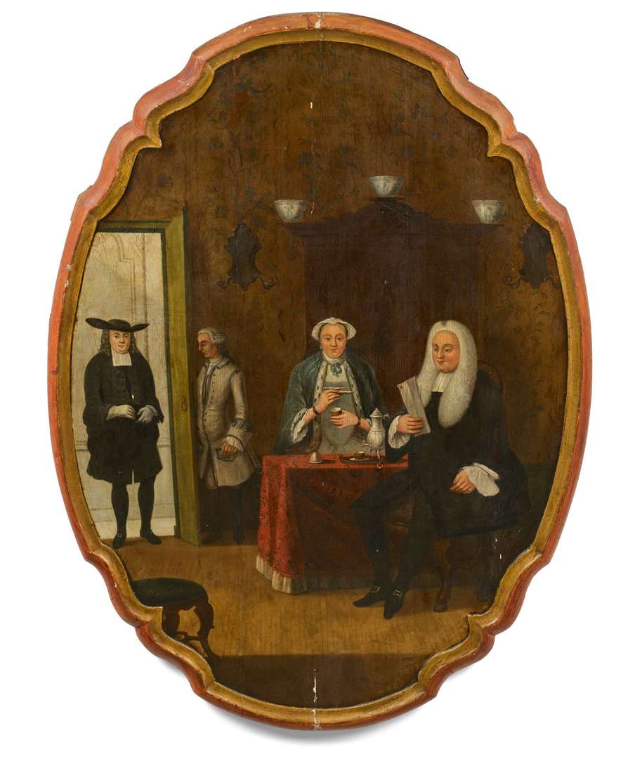 Un couple bourgeois attablé dans un intérieur cossu reçoit la visite d'un homme tout de noir vêtu. Un valet lui tenant la porte. À table Madame boit le thé et Monsieur lit une lettre. Huile sur bois ovale (parqueté). Pays-Bas, XVIIIe siècle.