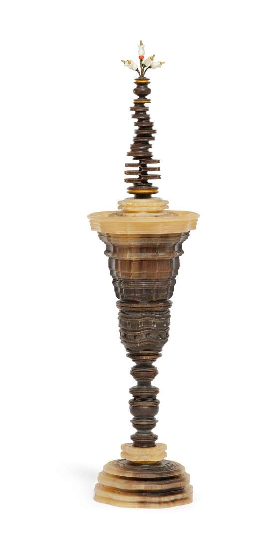 La panse et le couvercle à degrés circulaires. Le sommet du couvercle orné d'une colonne de disques surmontés d'un bouquet de six fleurs de nacre montées sur cuivre. La coupe repose sur une jambe tournée en balustre et un pied à gradin. Allemagne, style du XVIIe siècle.