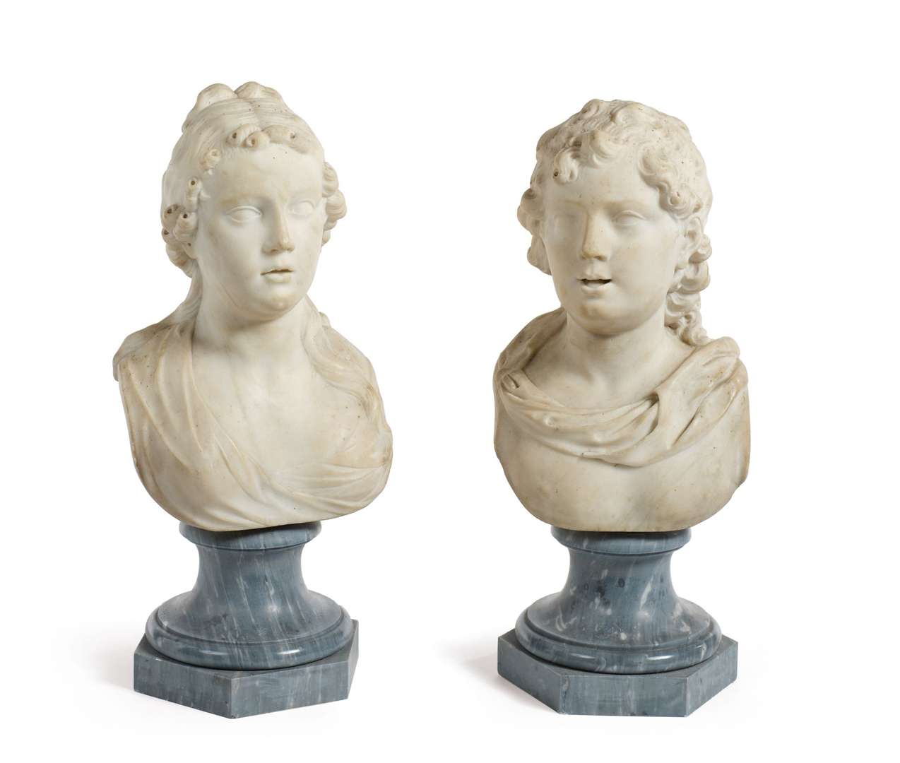 DEUX BUSTES de marbre blanc sculpté représentant respectivement un jeune homme et une jeune femme vêtus et coiffés à la manière antique. Le garçon, torse nu, cheveux mi-long, un voile tenu une fibule sur le haut du torse. La jeune coiffée d'un chignon, les cheveux retombant sur les épaules, portant une robe à l'antique. Les deux ont la bouche entrouverte laissant entrevoir les dents. France, début du XVIIIe siècle.