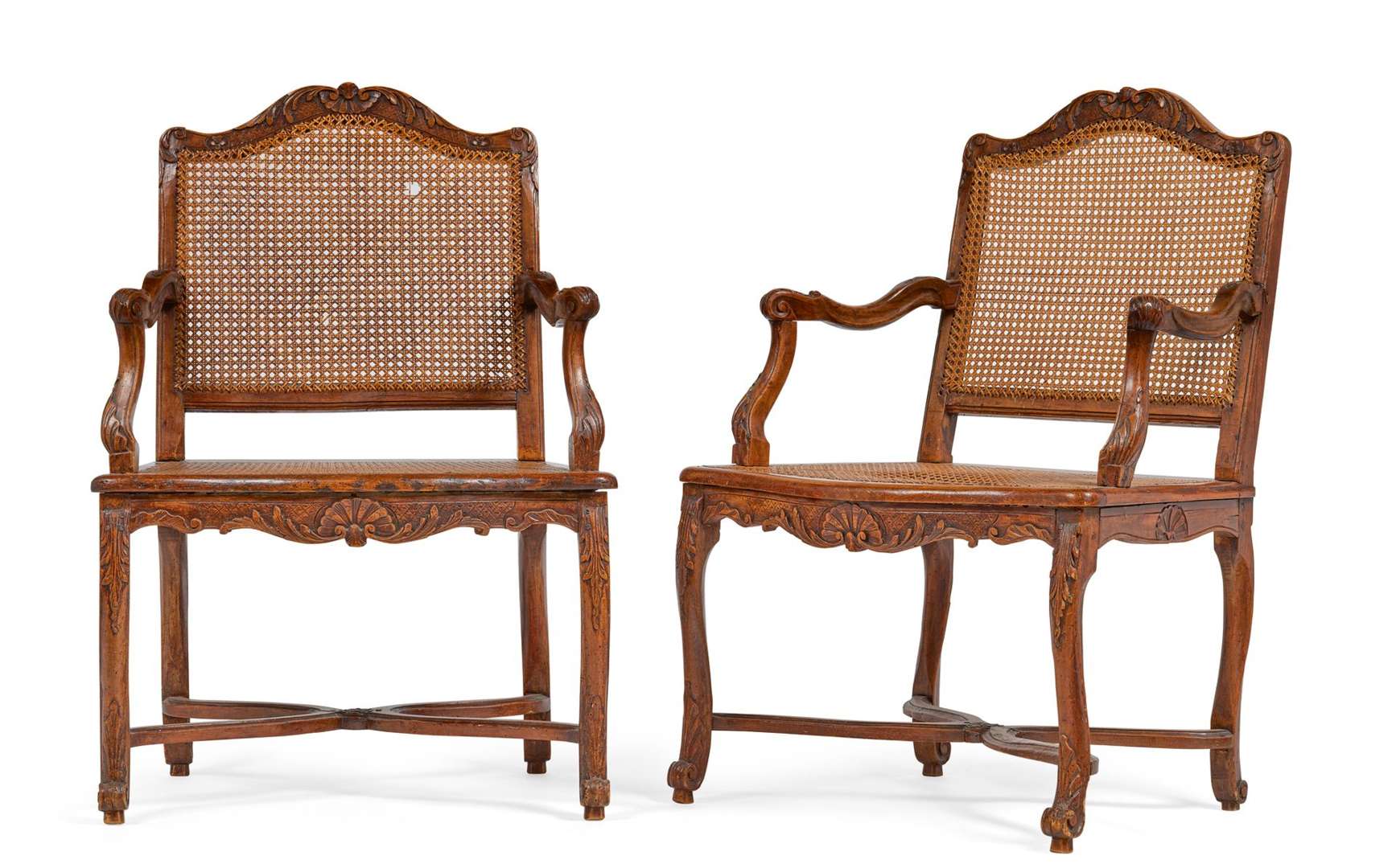 PAIRE DE FAUTEUILS cannés en hêtre mouluré sculpté à décor de rinceaux et palmettes, dossier à chapeau de gendarme, pieds cambrés terminés en enroulement et reliés par une entretoise en X. Époque Régence.