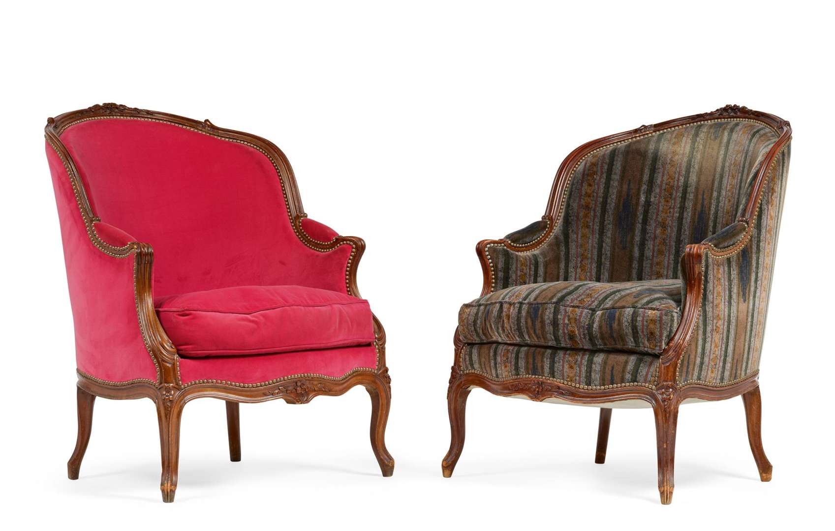 PAIRE DE BERGERES en hêtre mouluré sculpté de fleurettes, les supports d'accotoirs et les pieds galbés, tapisseries postérieures différentes. Style Louis XV.