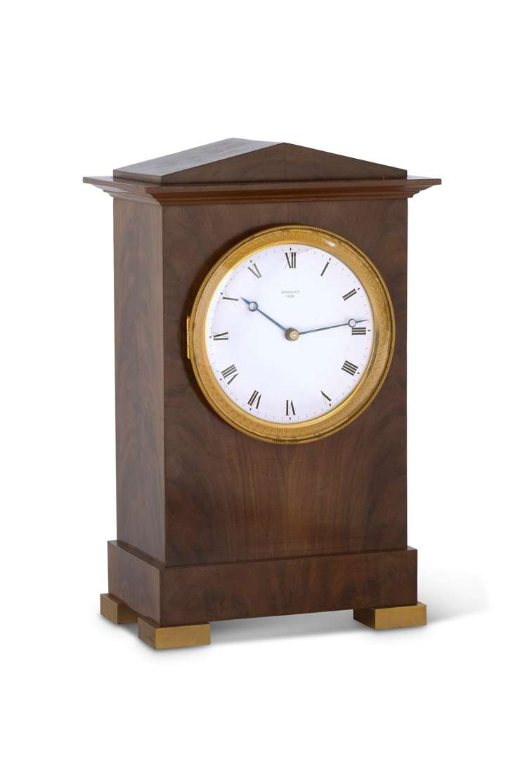 PENDULE TEMPLE en acajou, reposant sur quatre pieds en bois doré. Cadran indiquant les heures en chiffres romains. Il s'insère dans un encadrement circulaire en bronze ciselé et doré. Mouvement à quartz par Favag SA à Neuchatel. Style Empire.