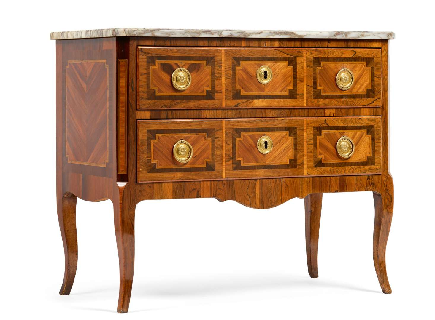 COMMODE SAUTEUSE ouvrant à deux tiroirs, en frisage de bois de rose dans des encadrements de bois noirci, les montants à pans coupés terminés par des pieds galbés. XVIIIe siècle, époque Transition. Dessus de marbre tendre veiné.