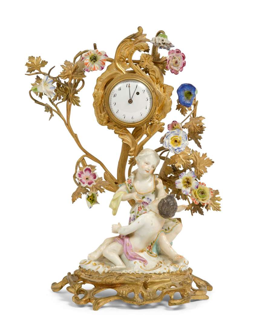 PORTE-MONTRE formant pendule formé d'un porte-montre en bronze doré avec un groupe en porcelaine polychrome d'une scène d'enfants jouant et des fleurs en porcelaine sertis dans une monture de bronze. Y est exposée une montre signée «Vassal Bvd des Italiens Paris». En partie du XVIIIe siècle.