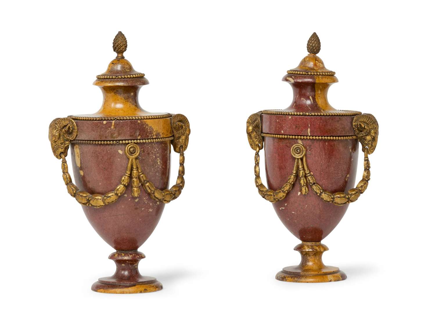 PAIRE D'URNES en pierre dure type jaspe mokaïte violet et caramel. Les monture en alliage doré à têtes de béliers et guirlandes de lauriers et rangs de perles, pommes de pin au sommet. Style Louis XVI, époque Napoléon III.