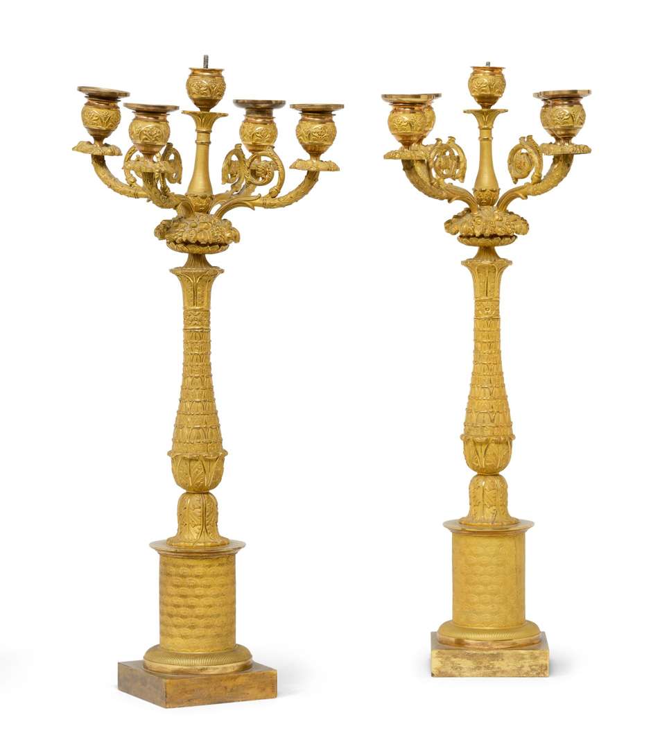 PAIRE DE CANDÉLABRES en bronze doré et ciselé, chacun cinq bras de lumière, le fût en colonne balustre, décor de fruits et feuilles d'eau. France, première moitié du XIXe siècle.