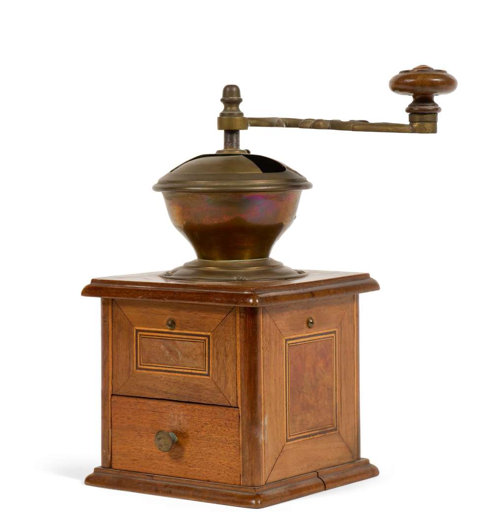 LOT DE SIX MOULINS à café et épices. Laiton, fer, verre, filets marquetés et bois tourné. L'un mural. XIXe siècle.