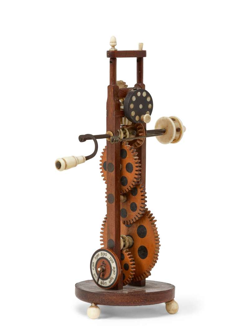 PETIT CHEF-D'OEUVRE en forme d'arbre mécanique fait d'une superposition d'engrenages en buis actionnés par une manivelle. En bas une roue de comptage indiquant le nombre de tours effectués, en haut un pivot sur roue désaxé. Base circulaire et piètement tripod (lesté au plomb au dessous). XIXe siècle.