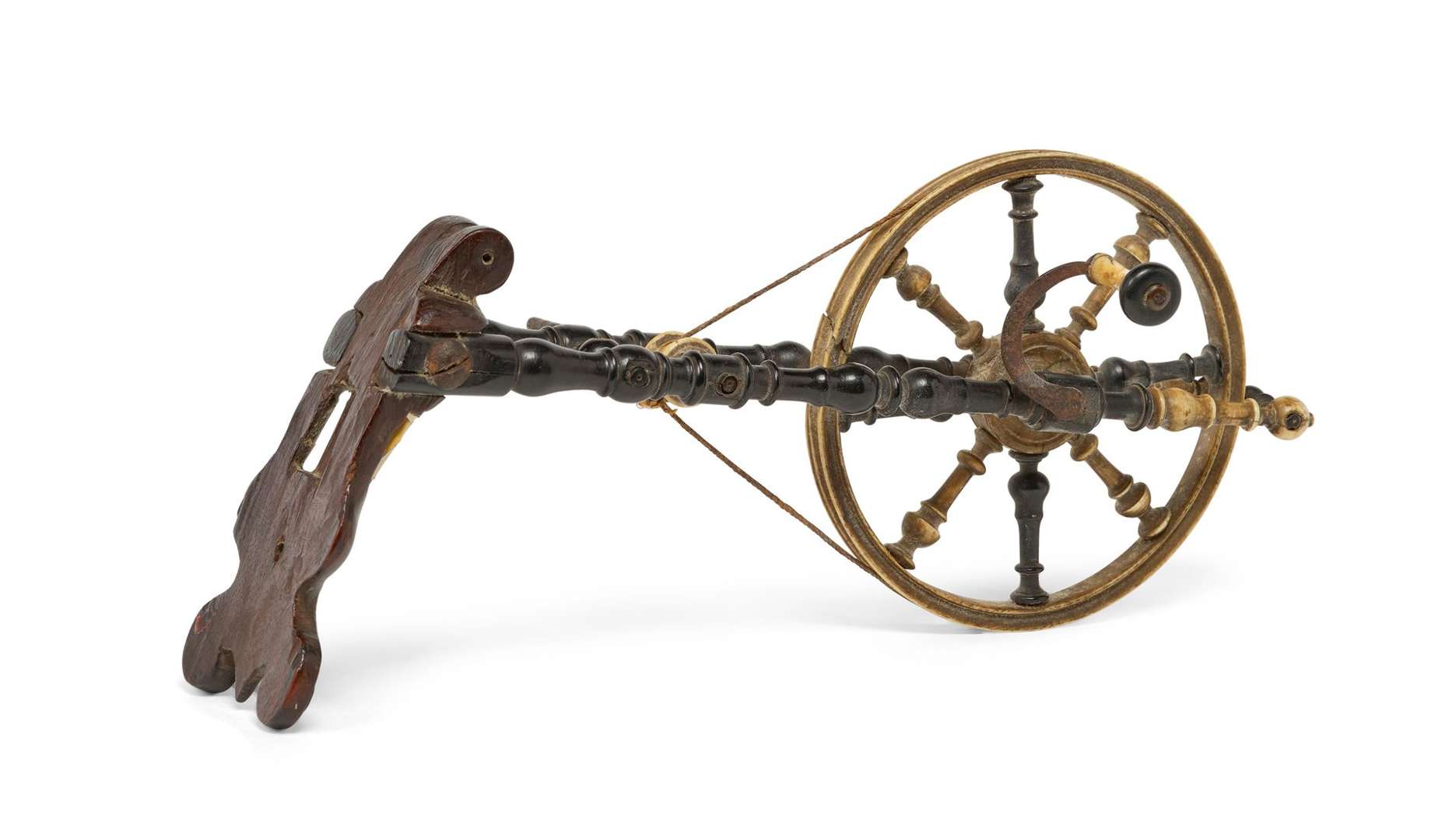 PETIT ROUET CHEF-D'OEUVRE de maîtrise en ébène tourné, la roue principale à huit rayons est actionnée par une manivelle de fer forgé et ébène. Les montants d'ébène. Pied de noyer sculpté de volutes en forme de prise femelle. Première moitié du XIXe siècle.