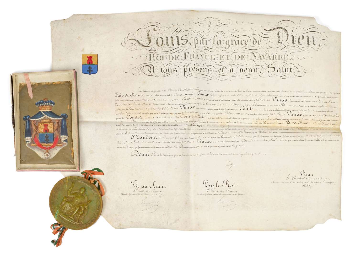 Signée par le roi Louis XVIII et par le Garde des Sceaux, avec empreinte du sceau royal en cire verte, conférant le titre de ComtePair de France contresignée par le duc de Richelieu, Président du Conseil, et le chancelier Pasquier, Garde des Sceaux, ministre de la Justice, Paris 9 décembre 1817 | vélin in plano, en-tête gravé, armoiries peintes, grand sceau de cire verte aux armes royales et à l'effigie du Roi sur le trône, pendant sur rubans roses et verts. Lettres de comte-pair héréditaire en faveur de Nicolas, comte Vimar (1744-1829), avec ses armes aquarellées et règlement d'armoiries qui concède au pair et à ses successeurs le droit de les placer.