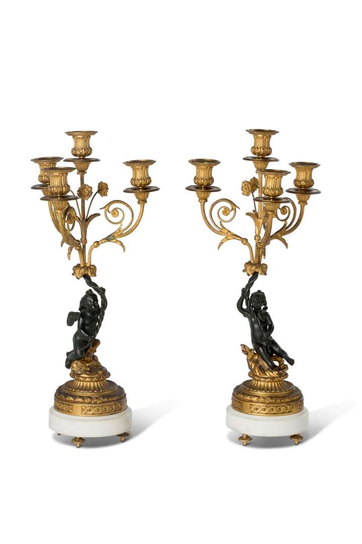 DEUX CANDÉLABRES en pendants, à quatre lumières en bronze doré et patiné noir. Le fût représentant respectivement une petite fille ailée et un petit garçon ailé tenant une corne d'abondance tressée d'où émergent quatre bras de lumière en bronze doré et ciselé à décor floral dans l'esprit de Gouthière. Style Louis XVI, fin du XIXe siècle.