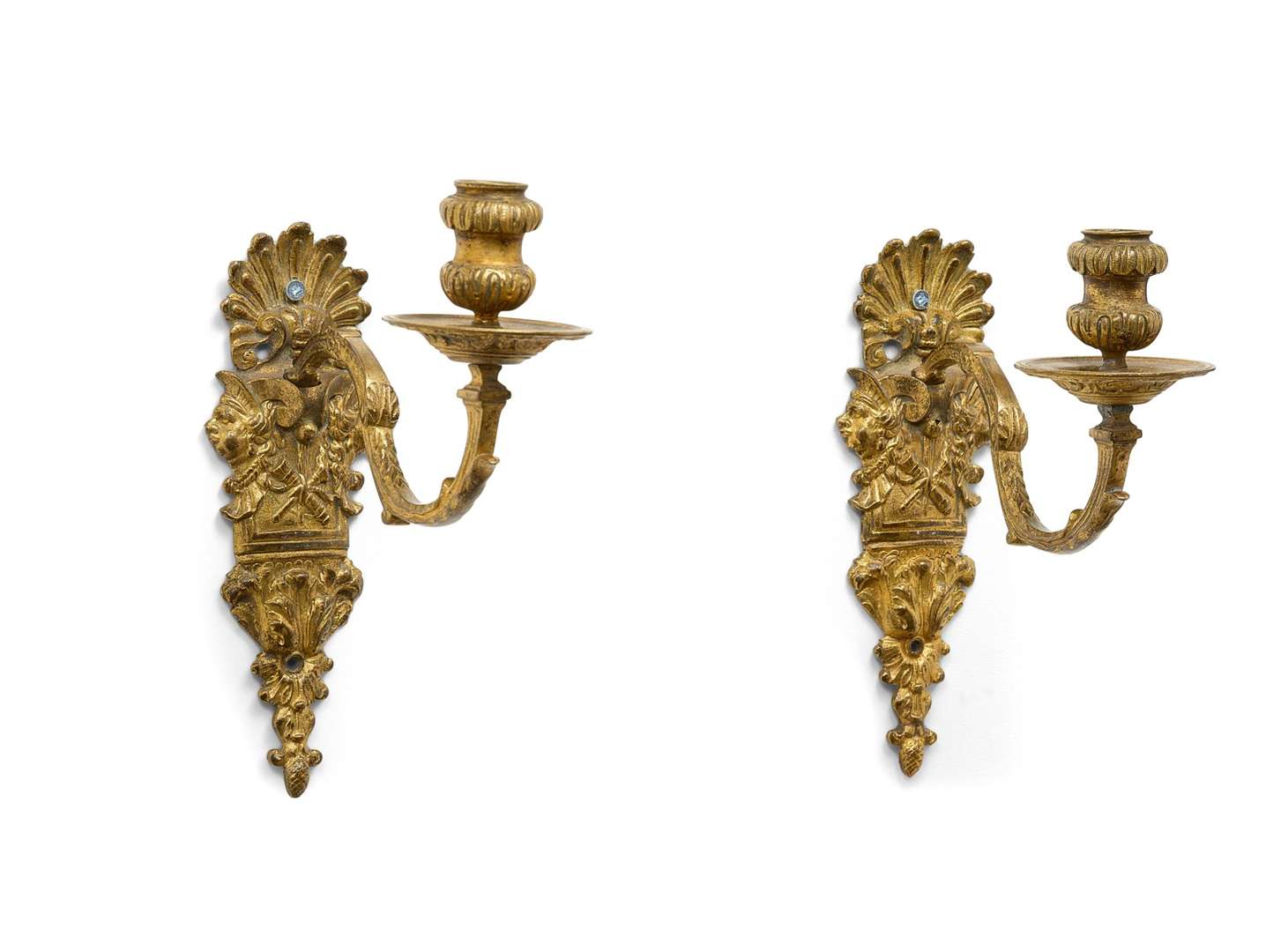 PAIRE D'APPLIQUES en alliage cuivreux ciselé et doré, la console aux masques de femme en espagnolettes adossées et trophée suspendu. Coquille rayonnante. Un bras de lumière. Époque Régence.