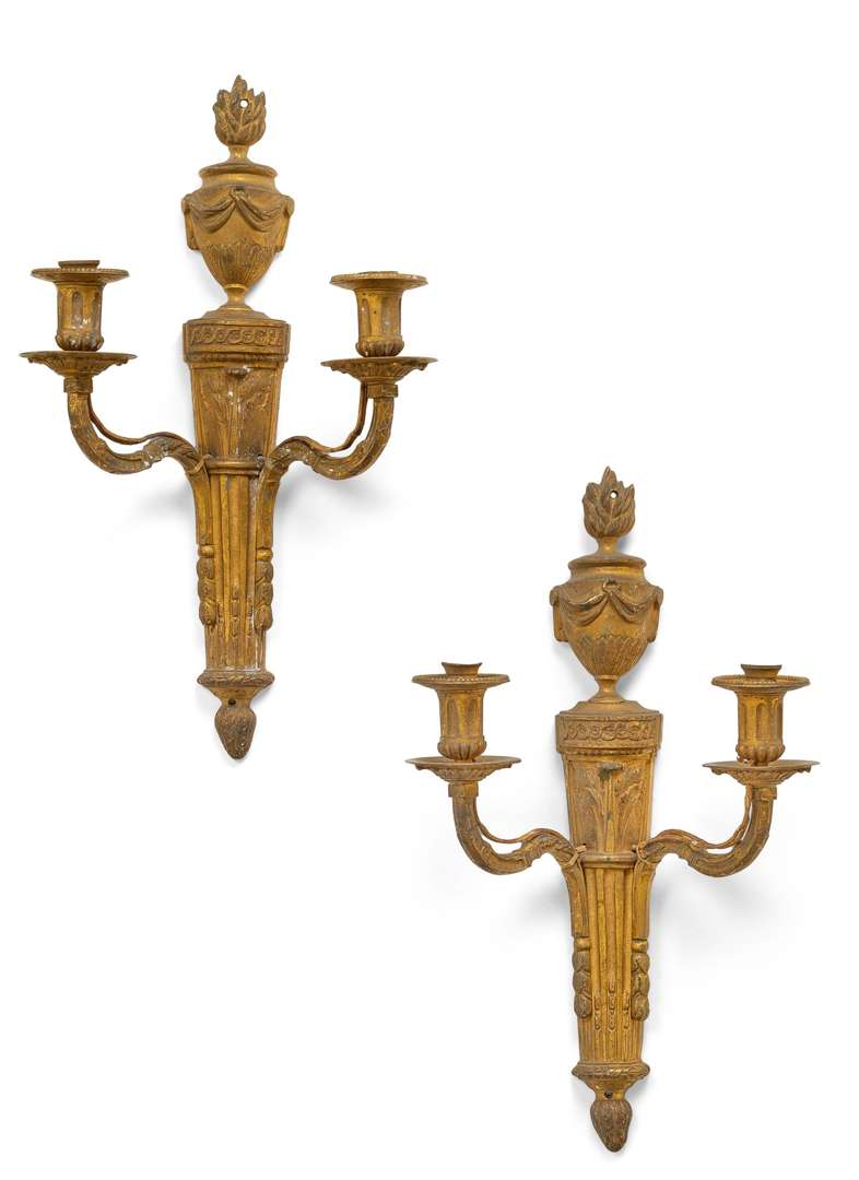 PAIRE D'APPLIQUES en bronze doré, deux bras de lumière, surmonté d'un pot à feu. Époque Louis XVI.