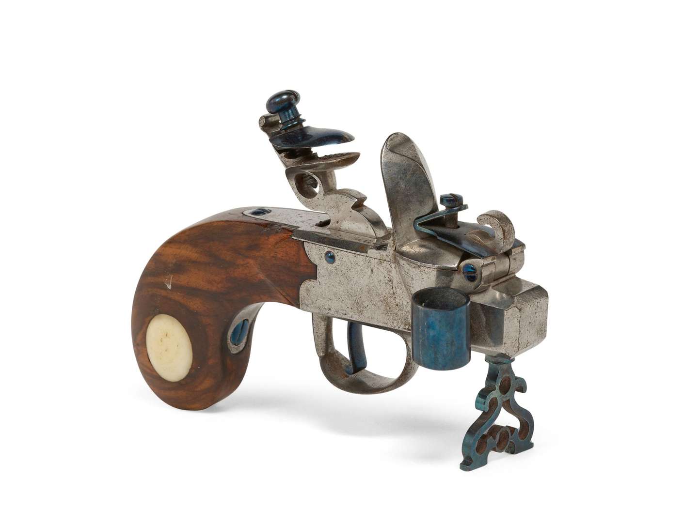 BRIQUET-PISTOLET à silex, la crosse en noyer, binet porte-feu latéral et certaines autres pièces en acier bleui. Début du XIXe siècle.