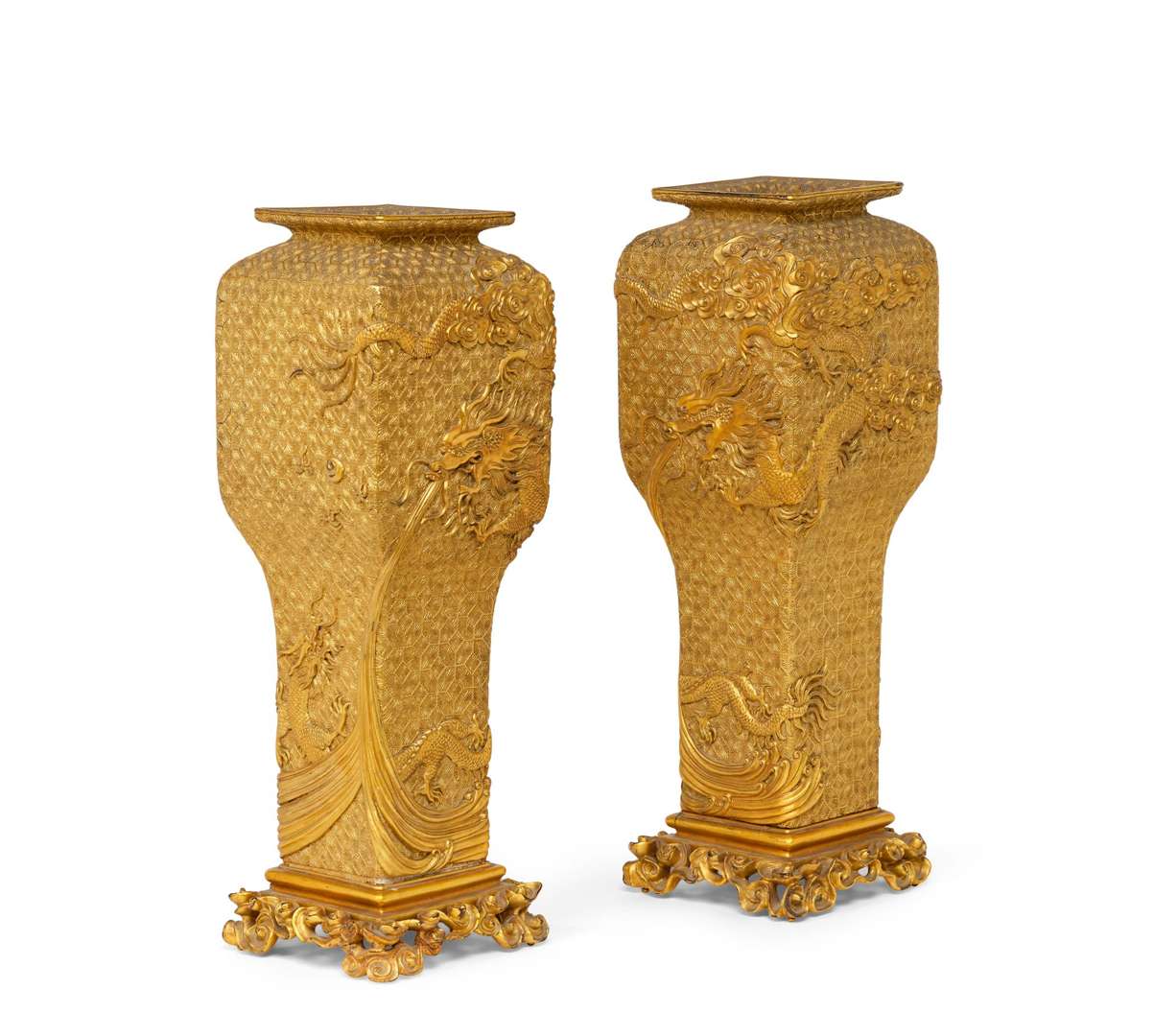PAIRE DE VASES de forme balustre à section carrée à fin décor de dragons à cinq griffes pourchassant la perle sacrée dans des nuées. Reposent sur des bases carrées ajourées. Chine, XXe siècle.