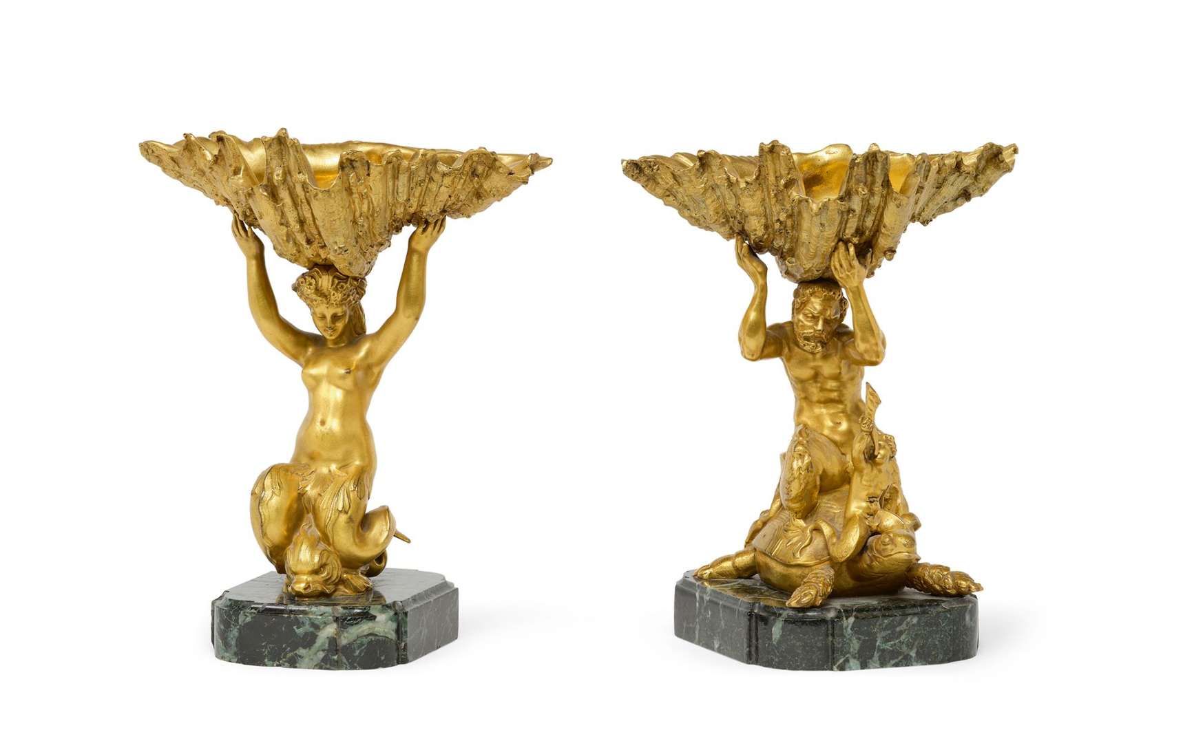 DEUX COUPES TAZZAS en pendants en bronze ciselé et doré représentant respectivement une sirène chevauchant un dauphin et un triton chevauchant une tortue avec un enfant triton. Tous deux supportent une grande coquille de bénitier. Sur des socles de marbre vert de mer. XIXe siècle.