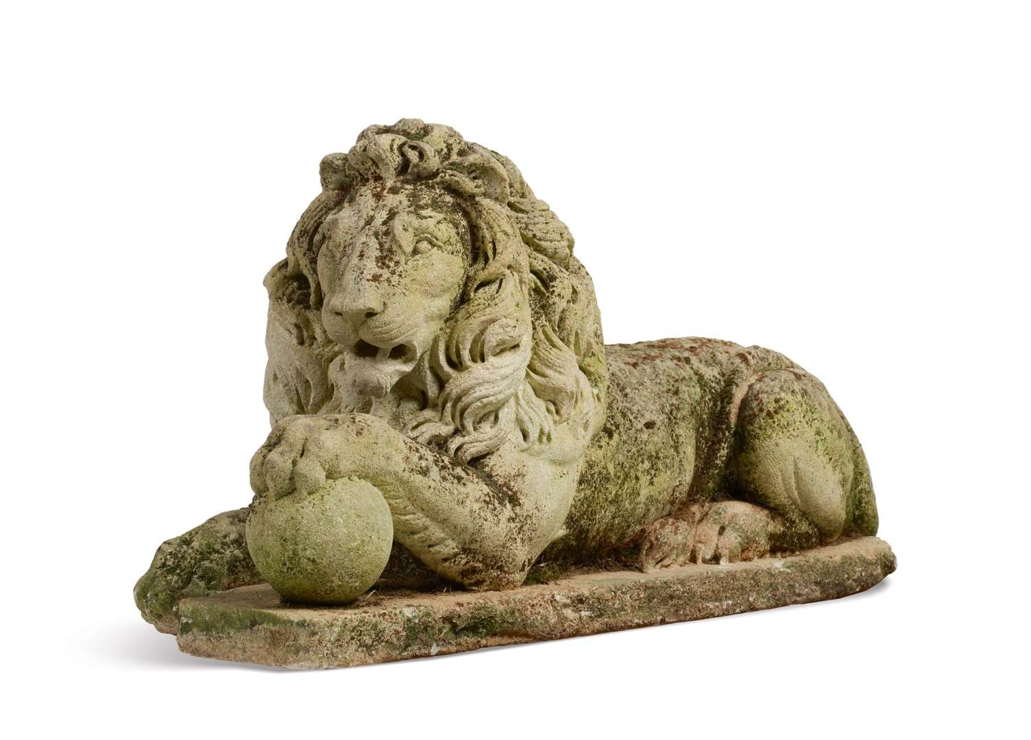 LION ÉTENDU en pierre sculptée, la patte droite posée sur un globe, sur un